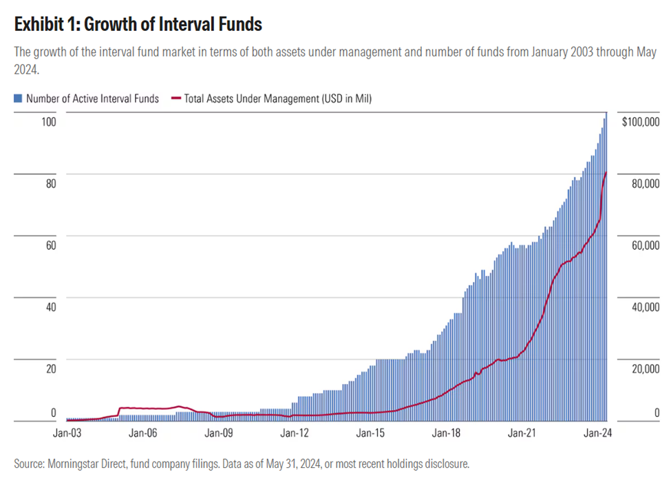 The prescribed packaging of choice for alternatives seems to be the interval fund, and by Morningstar’s estimate the march to $100B was all but a certainty as we entered 2025.